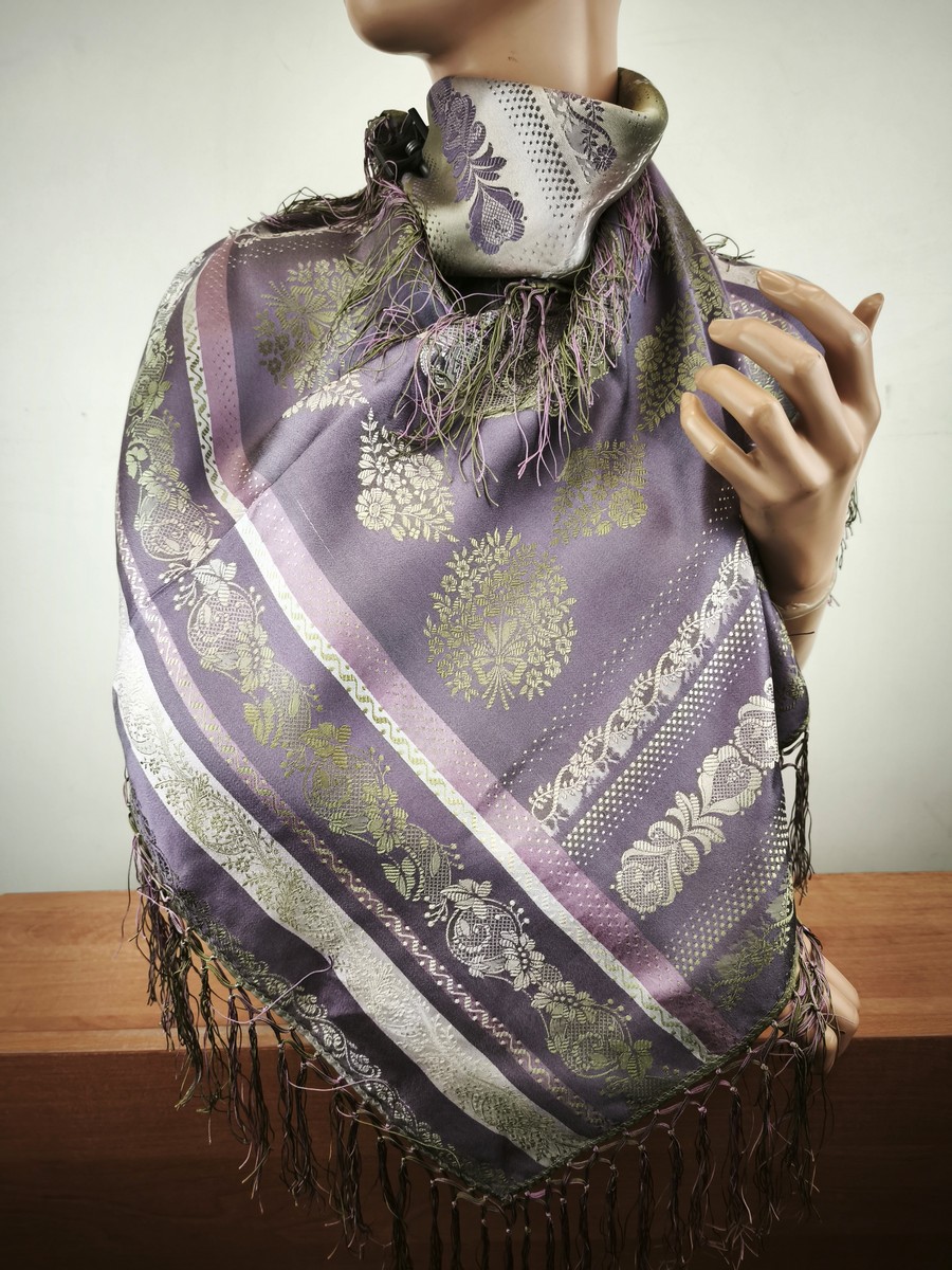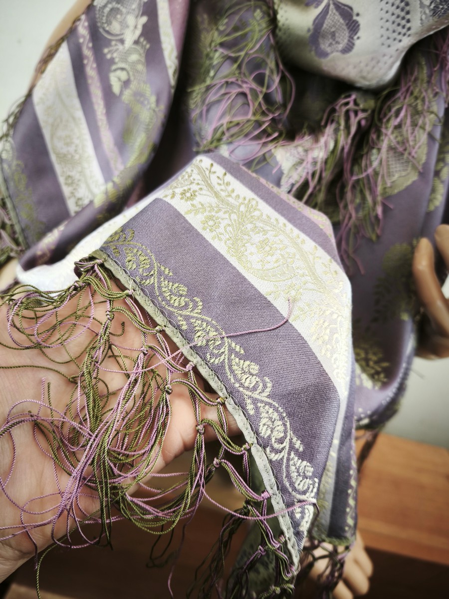 mięsisty jedwab, żakardowy wzór, ręcznie wiązane frędzle