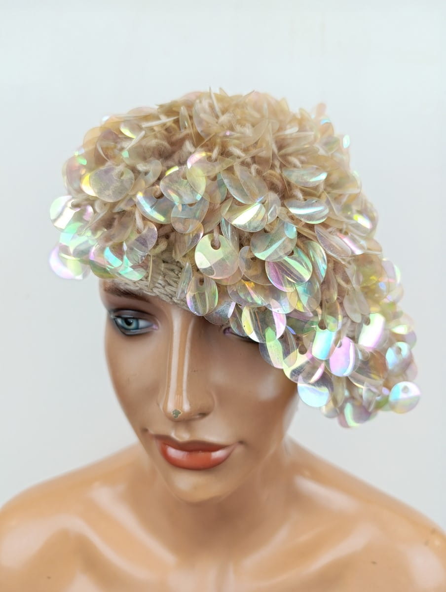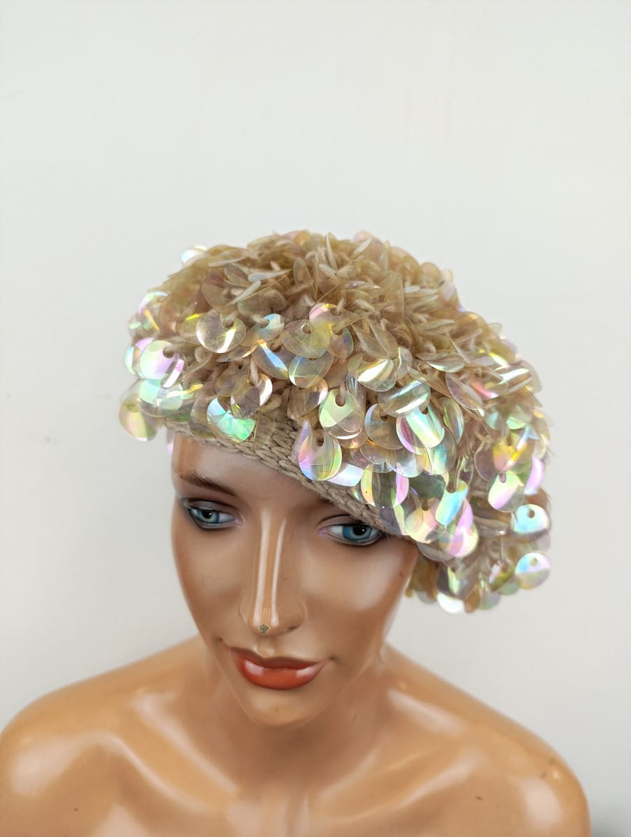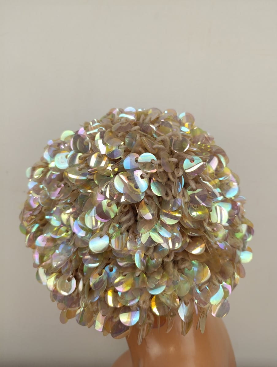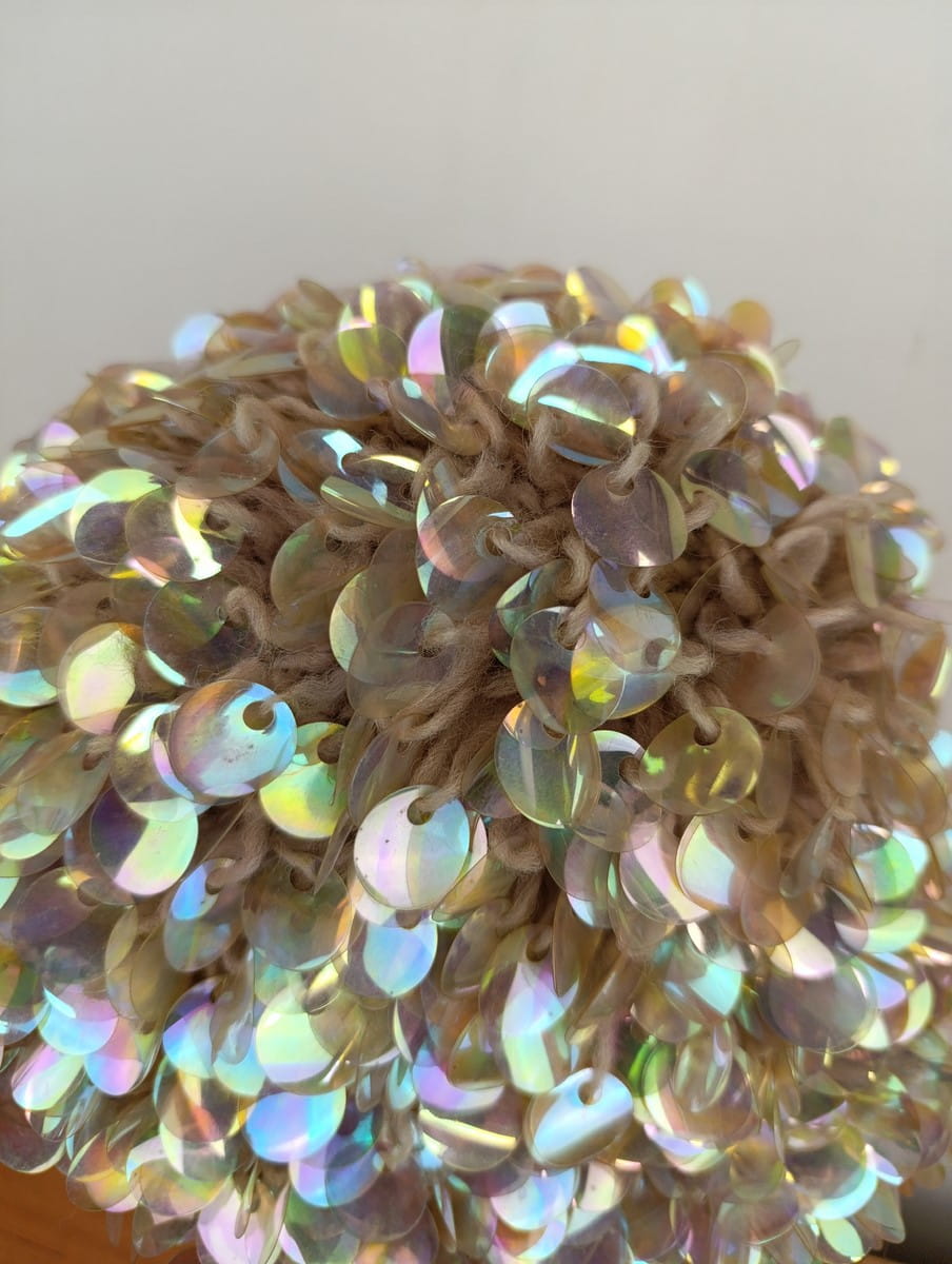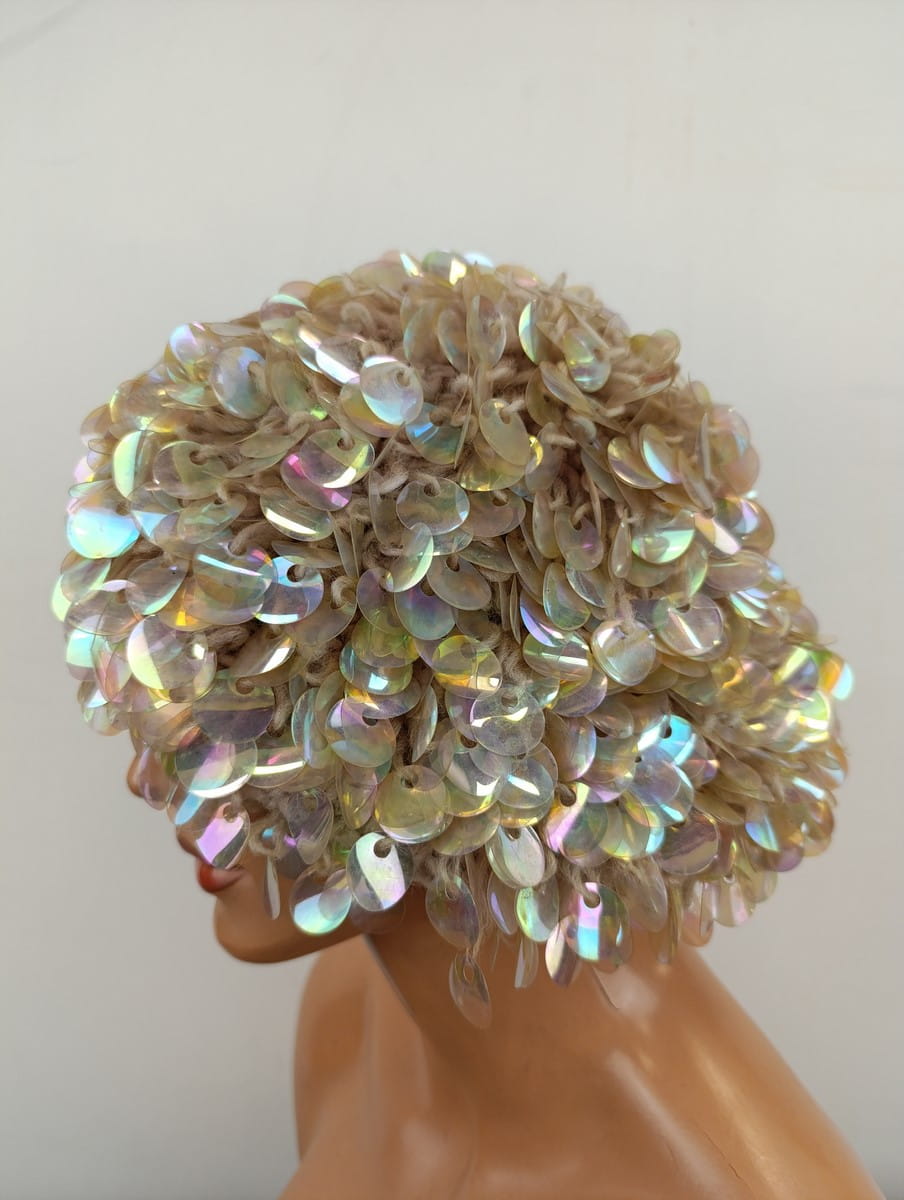 Beret włóczka wełniany cekiny jak rybia łuska 627777 beż