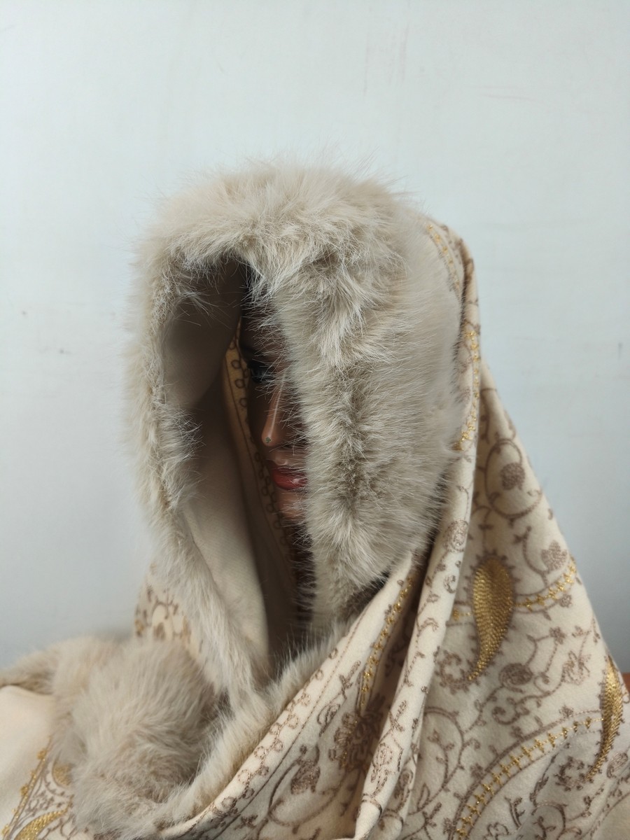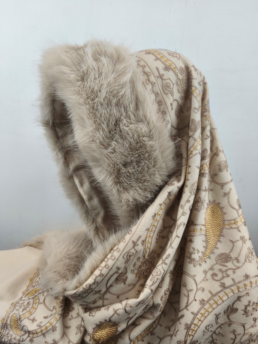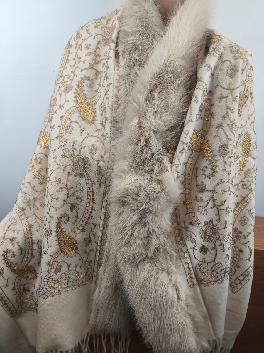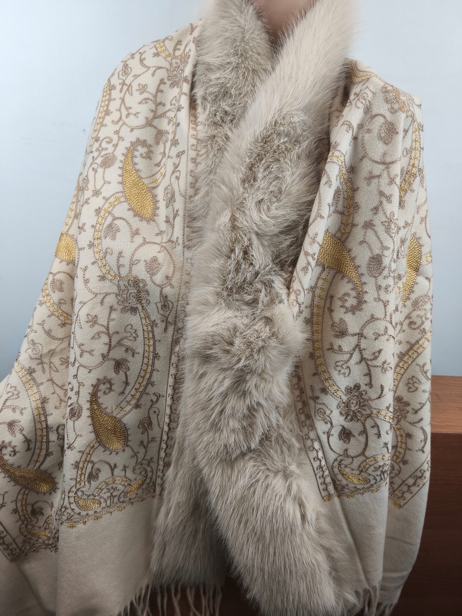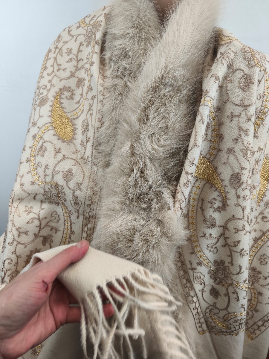 ponczo szalo-kaptur / szal z kaszmirem haftowany z eko futrem