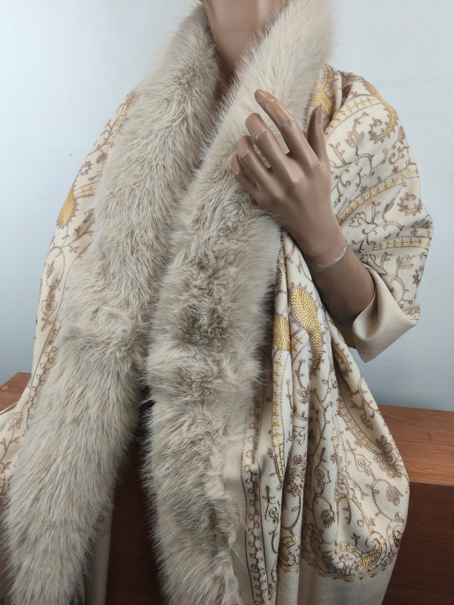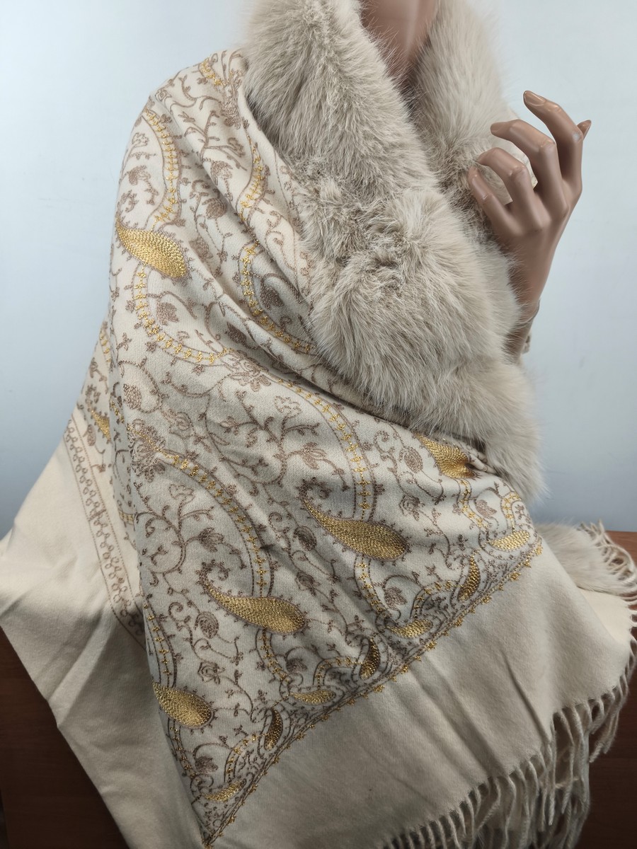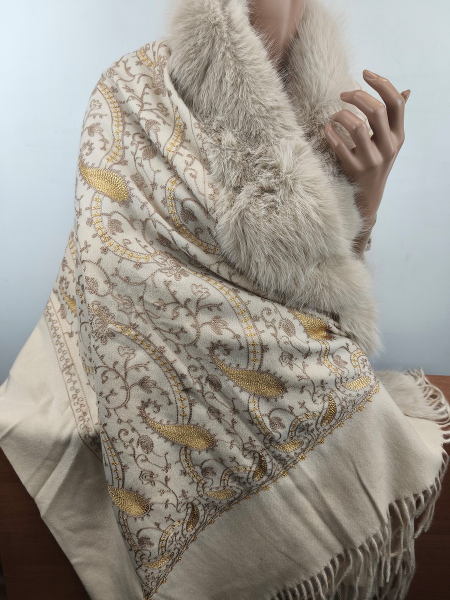 ponczo szalo-kaptur / szal z kaszmirem haftowany z eko futrem 0059940 beż