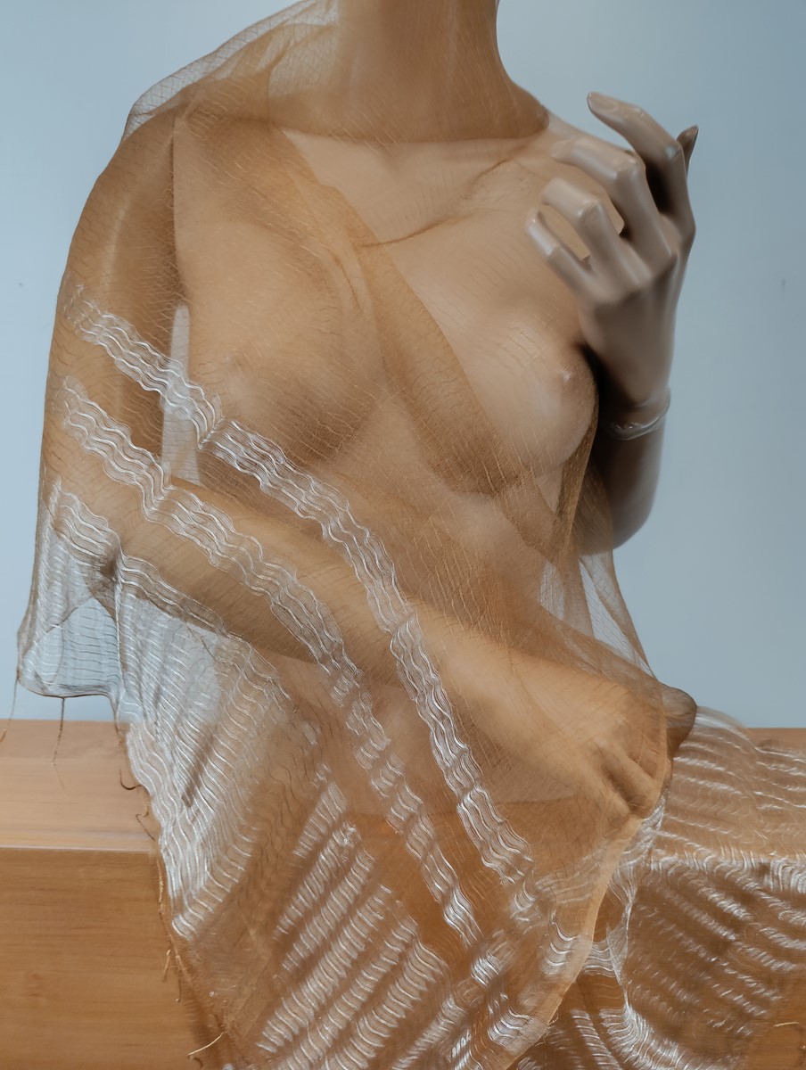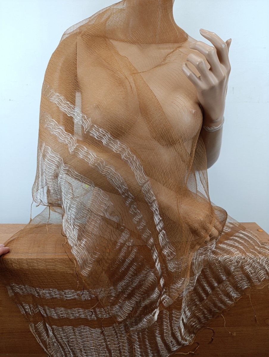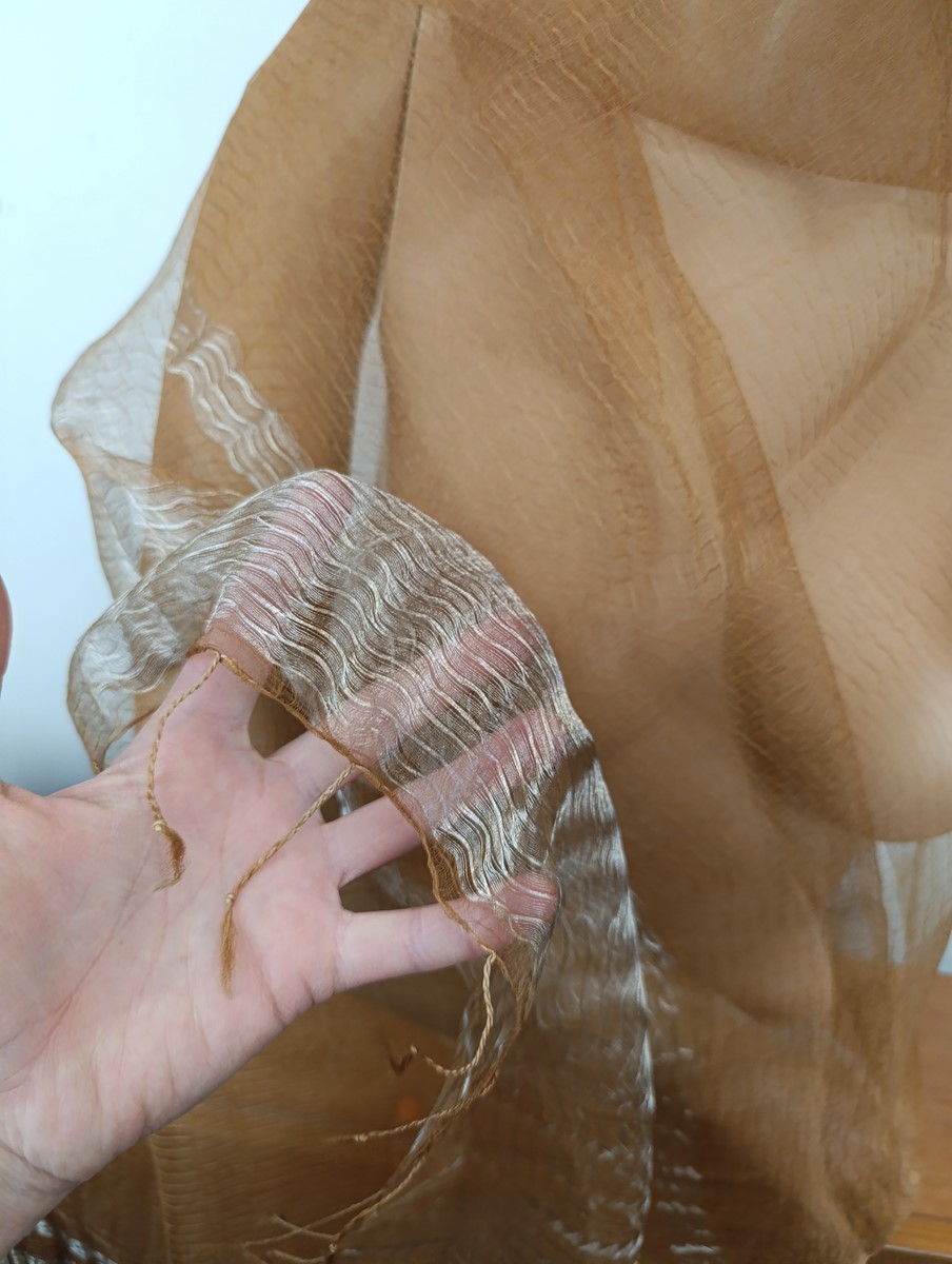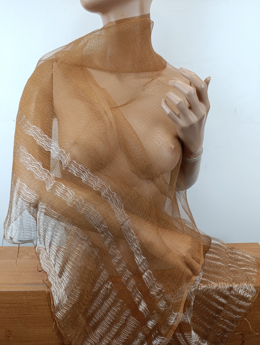 szal 100%j jedwab, półprzeżroczysty, lekko sztywny, surowy jedwab , pięknie się układa ( jak mgła), idealny do wieczorowego stroju oraz do sukni, wymiar 70/180 cm , wykończony srebrzystymi pasami, lekkie sreberko delikatne