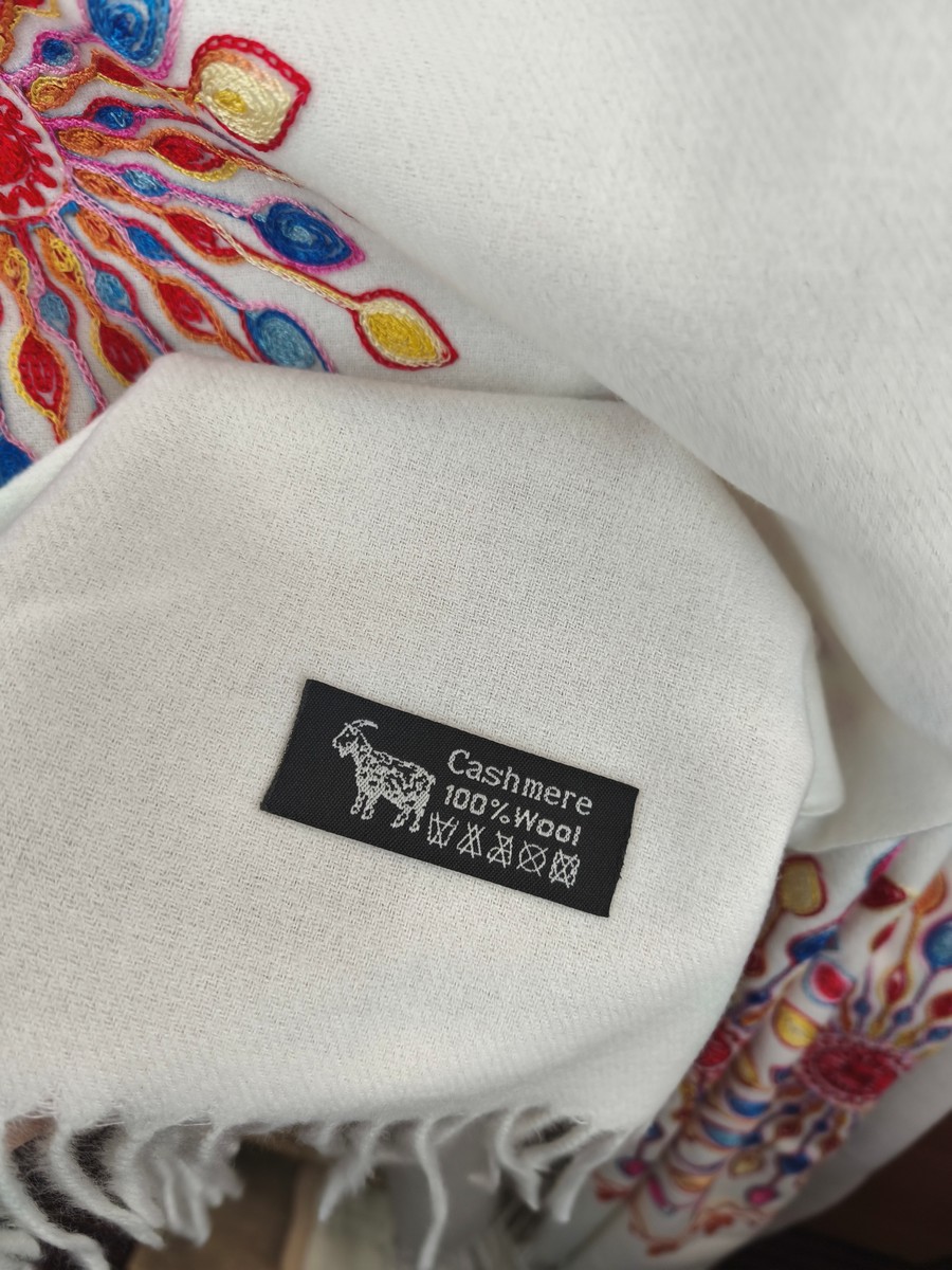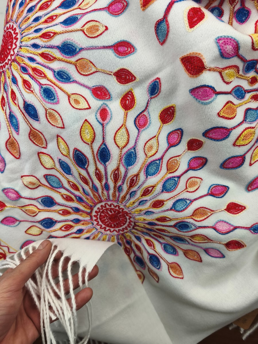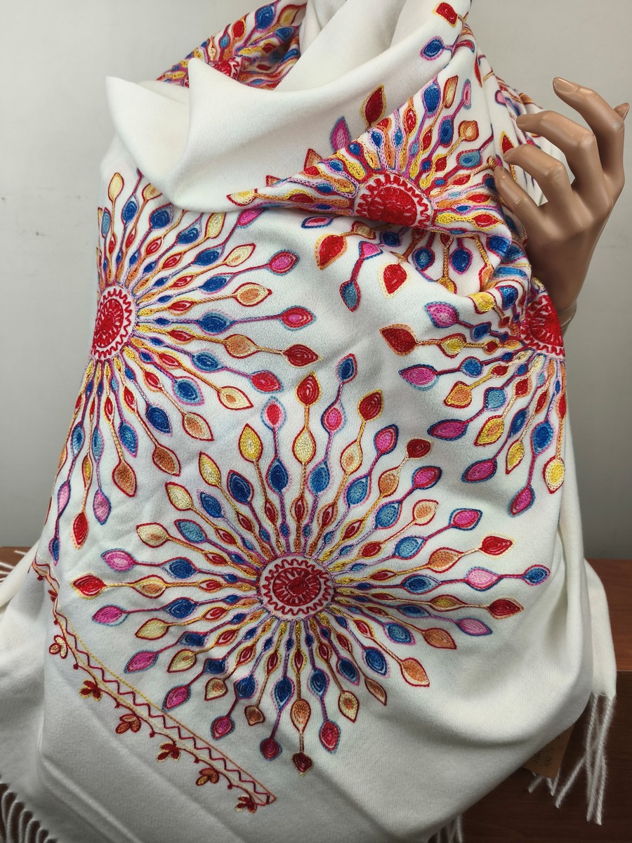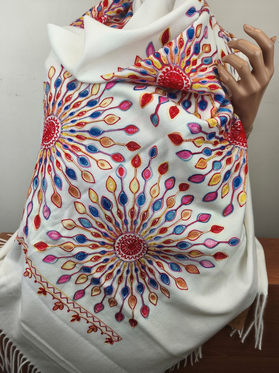 szal z kaszmirowy wełniany haftowany 00244022 ekri